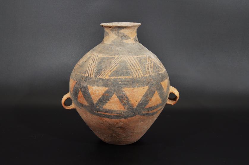 ARQUEOLOGÍA. CHINA. Neolítico. Cultura Majiayao. Vasija con dos asas y decoración geométrica (ca. 2500 a.C.). Cerámica. Altura 31 cm. Adjunta certificado de termoluminiscencia QED Laboratoire. Adjunta declaración de importación del Ministerio de Cultura de España (no sujeto a tasas de exportación).