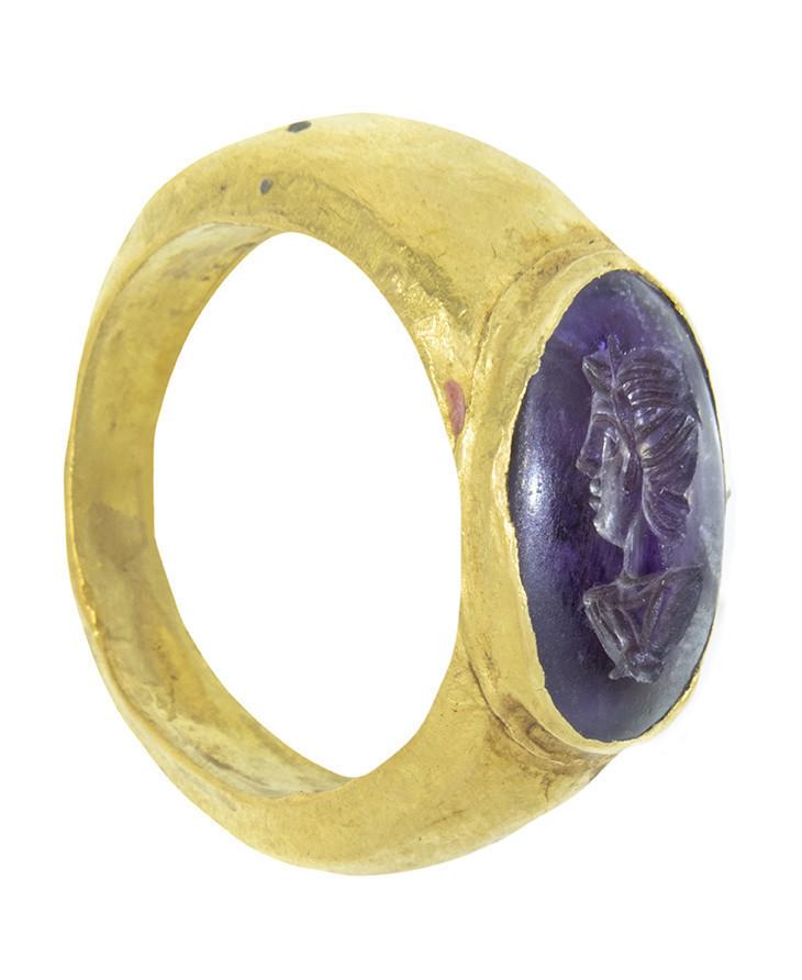 ARQUEOLOGÍA. ROMA. Anillo con entalle con representación de busto de Baco (ss. I-II d.C.). Oro y amatista. Longitud 27,7 mm. Peso 6,44 gr.