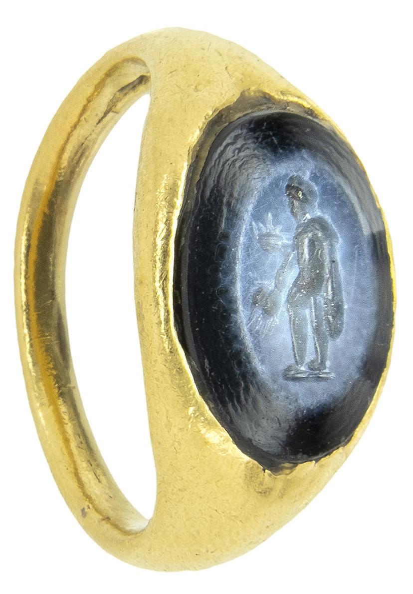 ARQUEOLOGÍA. ROMA. Anillo con un entalle que representa a Bonus Eventus (ss. I-II d.C.). Oro y nicolo. Longitud 22,1 mm. Peso 6,75 gr.