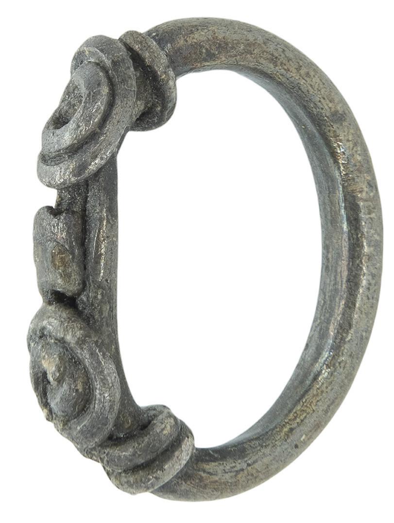 ARQUEOLOGÍA. ROMA. Anillo con aplique en relieve en forma de cabeza de Zeus-Amón (s. I-II d.C.). Bronce. Longitud 23,3 mm. Peso 4,07 gr.
