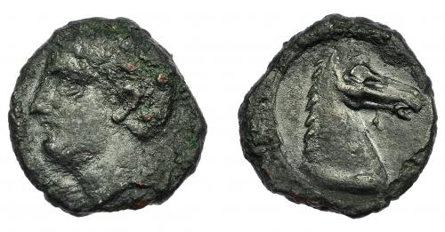 11   -  HISPANIA ANTIGUA. ACUÑACIONES HISPANO-CARTAGINESAS. Quinto. A/ Cabeza masculina a izq. R/ Cabeza de caballo a der. AE 2,11 g. 14,81mm. I-554. ACIP-610. MBC-/MBC+.