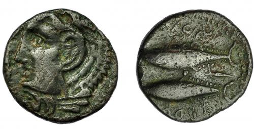 HISPANIA ANTIGUA. CUNBARIA. Semis. A/ Cabeza masculina a der., detrás S. R/ Atún a der., encima CVNB debajo ARIA. 18,3 mm. 3,49 g. I-878. ACIP-2620. BC/BC+. Escasa.