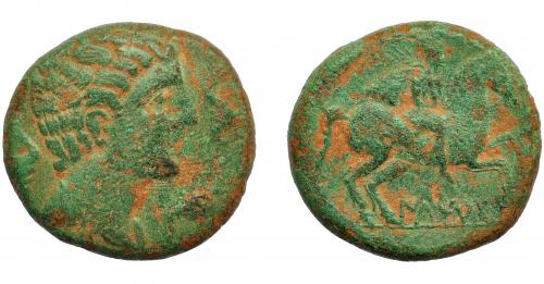 10   -  HISPANIA ANTIGUA. ACUÑACIONES HISPANO-CARTAGINESAS. Unidad. A/ Cabeza femenina con casco a izq.; debajo de la barbilla letra fenicia yod. R/ Caballo parado a der., debajo del vientre letra fenicia beth. AE 8,66 g. 25,27 mm. I-528. ACIP-593. Erosiones. Pátina oscura. MBC-. Muy escasa.