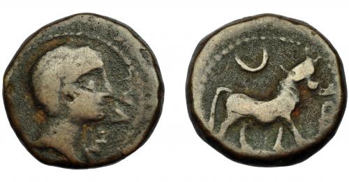 HISPANIA ANTIGUA. EMISIONES HISPANO-CARTAGINESAS. 1/4 de calco. A/ Cabeza masculina a izq. R/ Cabeza de caballo a der. AE 1,95 g. 13,6 mm. I-554. ACIP-610. Pátina verde. MBC-.