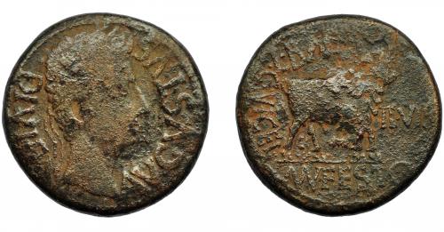30   -  HISPANIA ANTIGUA. CELSA. Augusto. As. A/ Cabeza laureada a der.; AVGVSTVS DIVI F. R/ Toro a der.; L BACCIO/MN PESTO- C V I CEL-II VIR. AE 18,69 g. 29,2 mm. I-809. APRH-273. ACIP-3164. Pátina marrón rugosa. BC+.