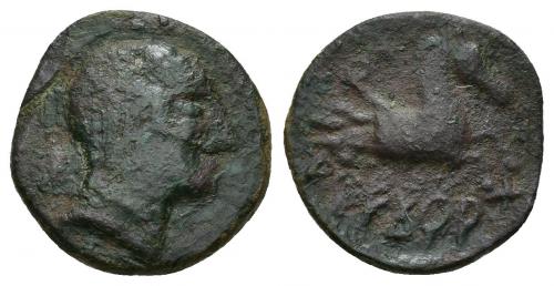 14   -  HISPANIA ANTIGUA. AREKORATAS. Cuarto. A/ Cabeza masculina a der. R/ Medio Pegaso a der., debajo ley. ibérica AREIKoRATa. AE 2,93 g. 17 mm. CNH-no publica. ACIP-No. CC-2022, mismo ejemplar. BC/BC+. Rarísima.