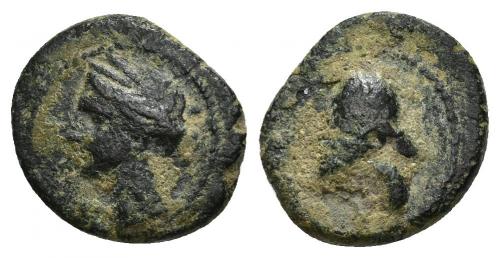 HISPANIA ANTIGUA. EMISIONES HISPANO-CARTAGINESAS. Quinto. A/ Cabeza femenina con tocado de espigas a izq. R/ Casco a izq. AE 1,55 g. 12,6 mm. ACIP-587. CC-210, mismo ejemplar. Pátina verde oscuro. BC+/MBC+.