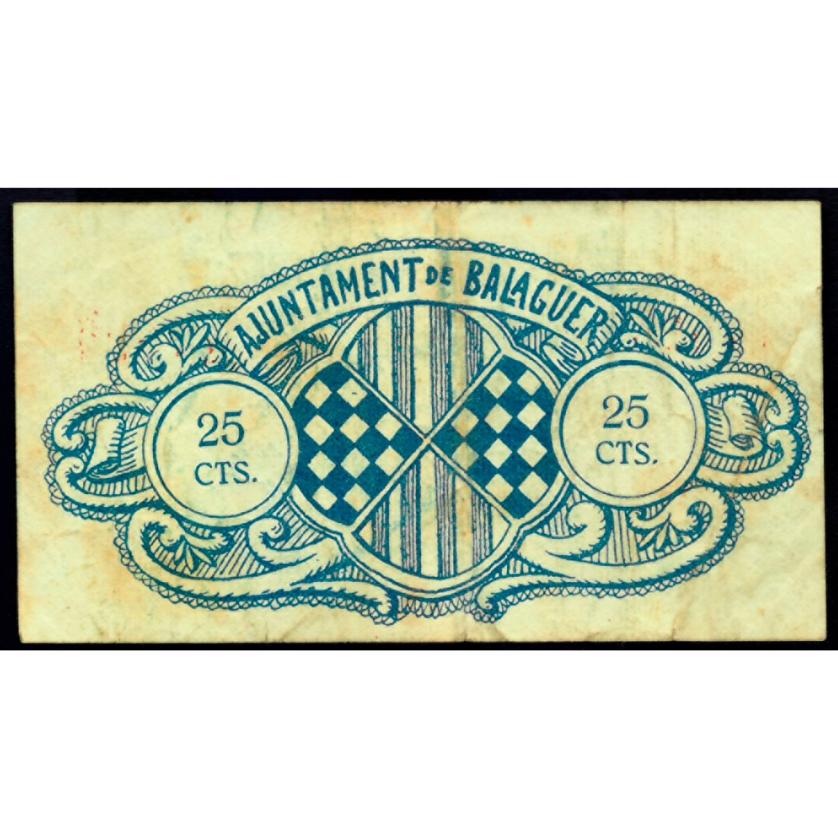 BILLETES LOCALES GUERRA CIVIL. 25 céntimos. 1937. Ayuntamiento de Balaguer. Turró-277. MBC.