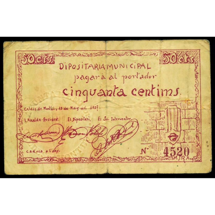 BILLETES LOCALES GUERRA CIVIL. 50 céntimos. 1937. Ayuntamiento de Caldes de Montbui. Turró-597. MBC.