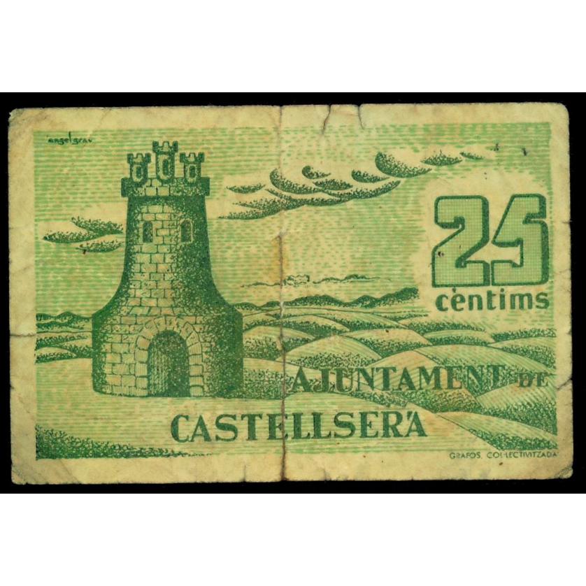 BILLETES LOCALES GUERRA CIVIL. 25 céntimos. 1937. Ayuntamiento de Castellsera. Turró-766. Partido. MBC-.