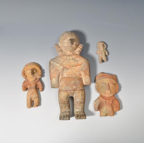 ARQUEOLOGÍA. PREHISPÁNICO. Lote de 4 figuras. Diferentes épocas y culturas. Cerámica. Altura de 10 a 13,5 cm. Fragmentadas y restauradas. Ex colección Cores.
