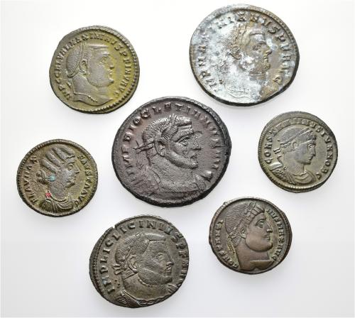 IMPERIO ROMANO. Lote de 7 follis: módulo grande (2), módulo mediano (2) y módulo pequeño (3). MBC-/MBC+.
