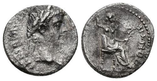 PERIODO DE JULIO CÉSAR A AUGUSTO. AUGUSTO. Denario. Lugdunum (7-6 a. C.). A/ Cabeza laureada de Augusto a der. R/ Cayo y Lucio con lanzas y escudos, en el centro símpulo y lituus; C L CAESARES AVGVSTI F COS DESIG PRINC IVVENT. AR 3,19 g. 17,8 mm. RIC-207. FFC-222. Campos repasados. MBC.
