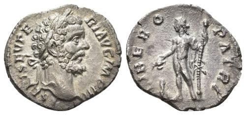 IMPERIO ROMANO. SEPTIMIO SEVERO. Denario. Roma (194 d. C.). A/ Cabeza laureada a der.; L SEPT SEV PERP AVG IMP III. R/ Liber a izq. con tirso y vaciando oinocoe sobre pantera; LIBERO PATRI. AR 2,77 g. 19,2 mm. RIC-32. Cospel irregular. EBC-.