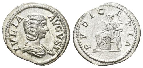 IMPERIO ROMANO. JULIA DOMNA. Denario. Roma (196-211 d. C.). A/ Busto drapeado a der.; IVLIA AVGVSTA. R/ Pudicitia sentada a izq. mirando al frente, con cetro y mano en el pecho; PVDICITIA. AR 2,73 g. 19,64 mm. RIC-575. Hoja en anv. EBC-/MBC+.