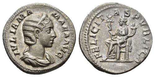 IMPERIO ROMANO. JULIA MAMEA. Denario. Roma (225-235 d. C.). A/ Busto drapeado y diademado a der.; IVLIA MAMAEA AVG. R/ Felicitas sentada a izq. con cornucopia y caduceo; FELICITAS PVBLICA. AR 3,11 g. 18,91 mm. RIC-338. MBC+.