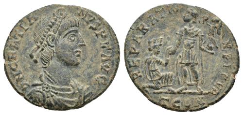 IMPERIO ROMANO. GRACIANO. Follis. Arelate (378-383). A/ Busto diademado, drapeado y acorazado a der.; D N GRATIANVS P F AVG. R/ Emperador con Victoria a izq. tendiendo la mano a mujer torreada arrodillada ante él; REPARATIO REI PVB. -/-//TCON. AE 4,4 g. 23,3 mm. RIC-20A, suptipo 3. MBC+.