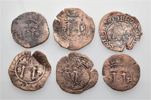 JUANA Y CARLOS. Lote de 6 monedas de 4 maravedís para Santo Domingo. Limpiadas. RC.