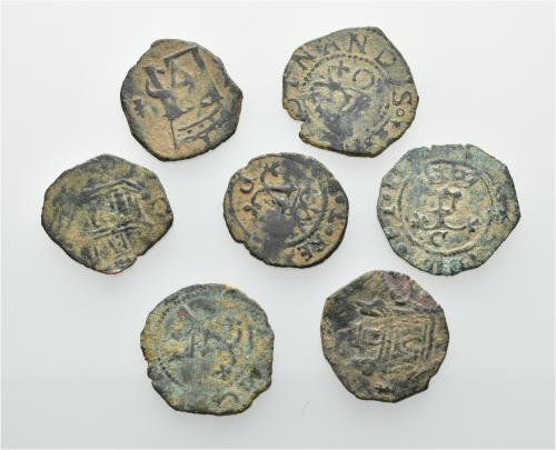 FELIPE II. Lote de 7 maravedís y blancas de Reyes Católicos y Felipe II. Varias cecas. BC/BC+.
