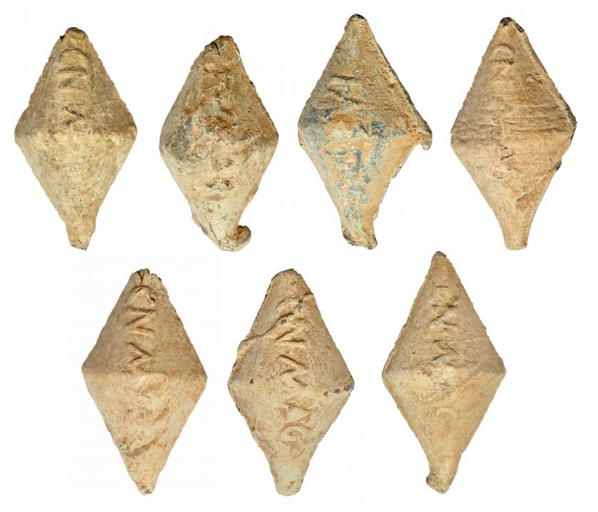 707   -  ROMA. Repúbica Romana. Plomo. Lote de siete glandes bicónicos con inscripción CN. MAG. Longitud: 4-5 cm.  Procedente de colección privada española años 1970-80.
