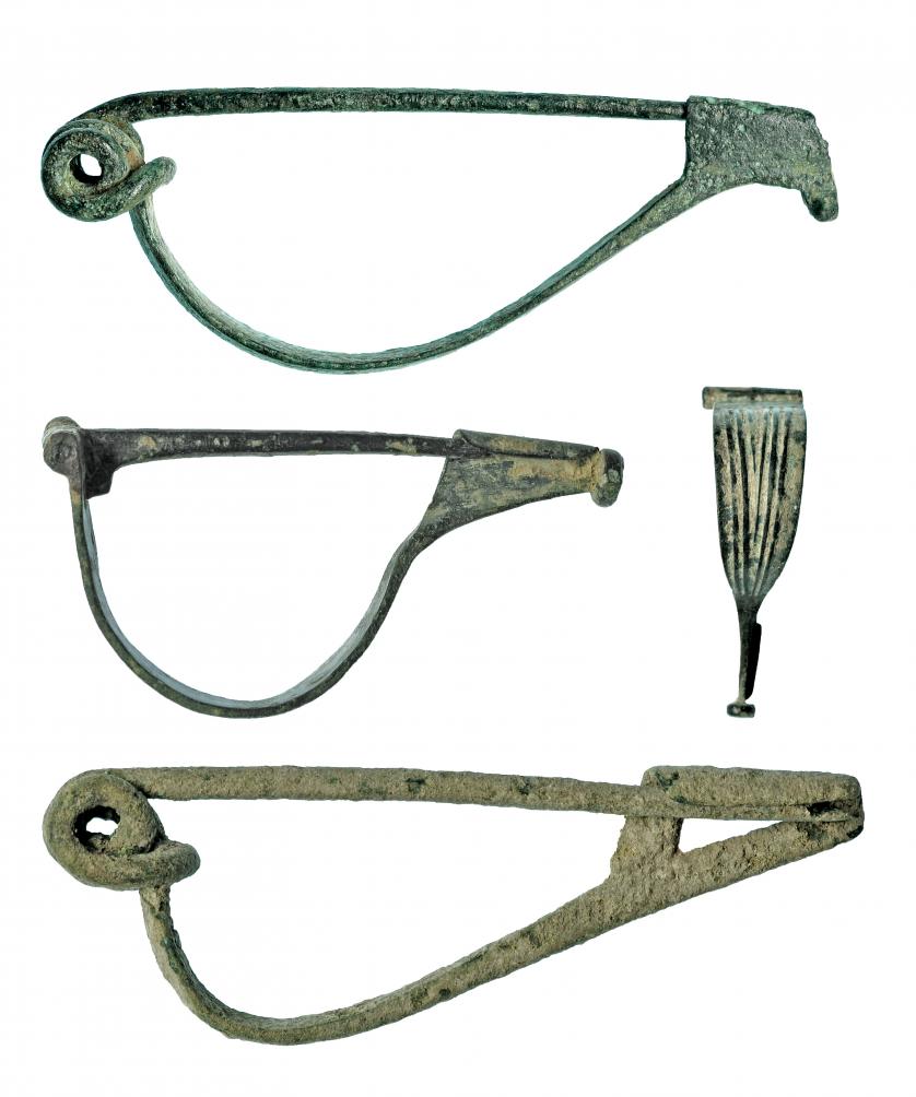 ROMA. Imperio Romano. Bronce. Lote de tres fíbulas: Una de arco de tipo Aucissa y dos de arco tipo draadfibulae. Longitud: 7,3; 7,0 y 5,0 cm. Procedente de colección privada española años 1970-80.