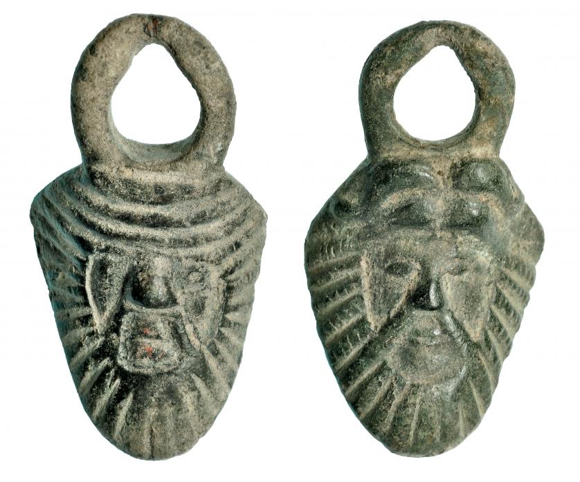 ROMA. Imperio Romano. Bronce. Lote de 2 apliques de asas de sítula con representación de rostro humano esquemático. Altura: 7,4 y 7,1 cm. Procedente de colección privada española años 1970-80.