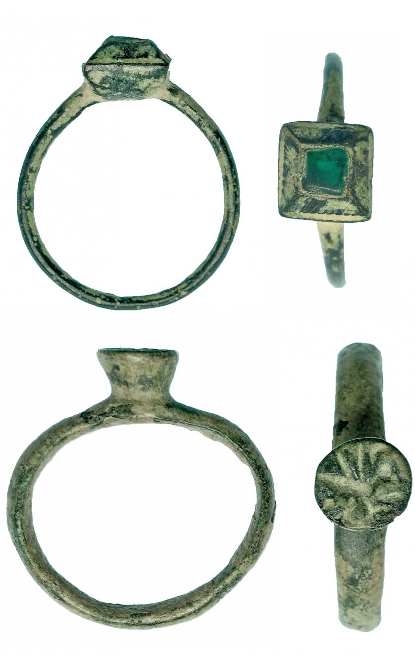 ROMA. Imperio Romano. Bronce y ágata verde. Lote de dos anillos, uno con piedra verde y otro con ave. Diámetro: 17 y 19 mm. Siglos IV-VI. Procedente de colección privada española años 1970-80.