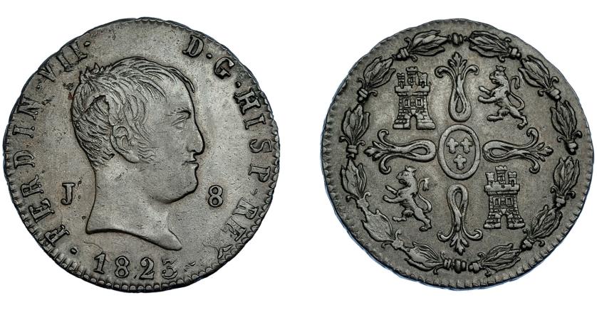 FERNANDO VII. 8 maravedís. 1823. Jubia. VI-214. Hoja sin saltar en anv. MBC+. Escasa.